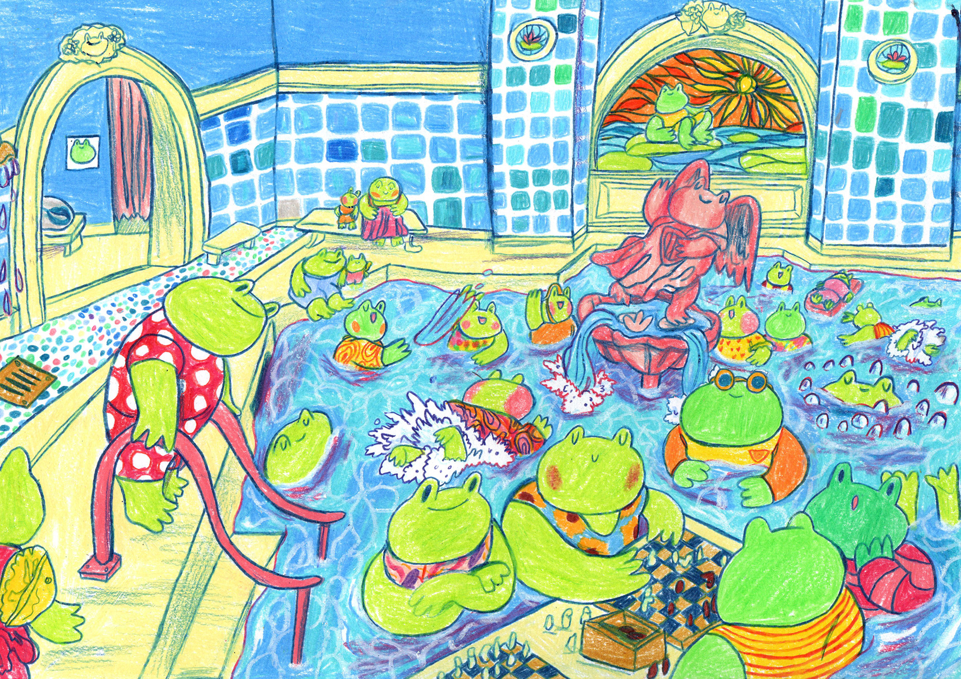 Self initiated children's book spread of some frogs at the baths.