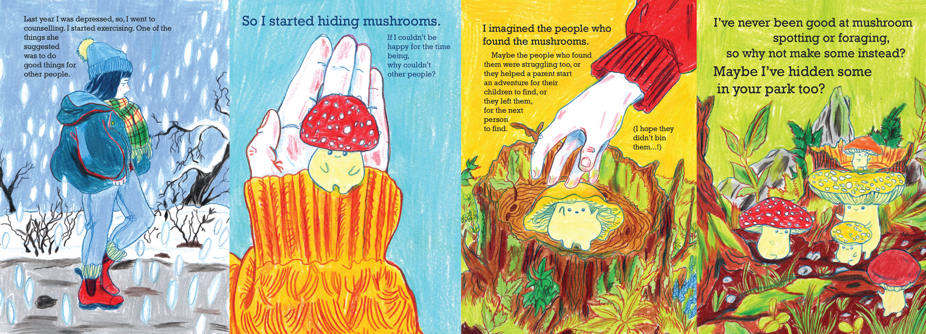 This is a zine I made after I was struggling with my mental health after my friend passed away. I hid this zine around my local area, alongside pottery mushrooms, and got people to find these.
